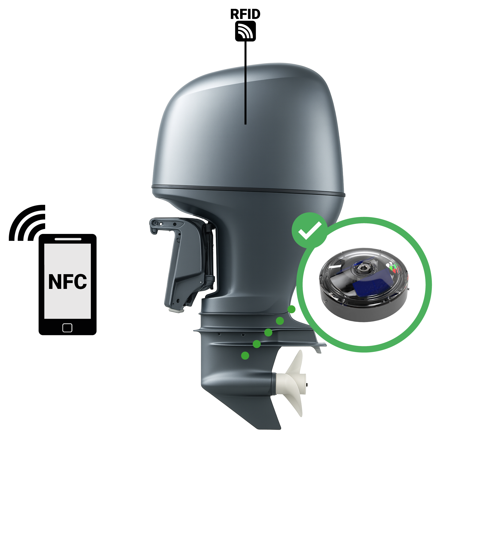 For standalone outboard motors with RFID/NFC connectivity to communicate with the engine